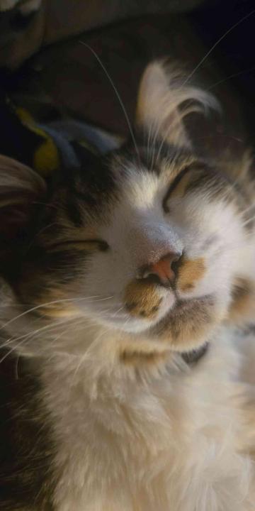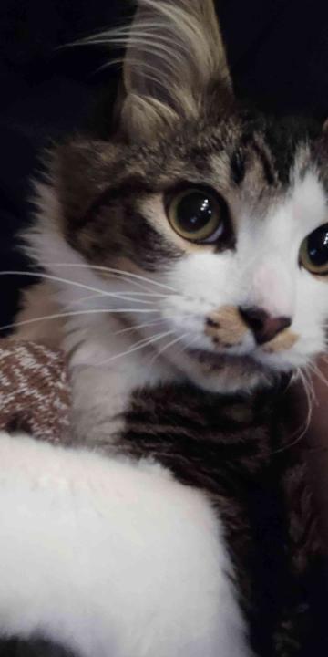 he has a red spot on his foot (he got hurt a while ago) he was lost with his collar on an black bandana it doesn't fit that good but it works